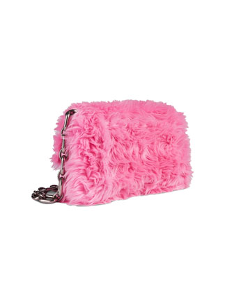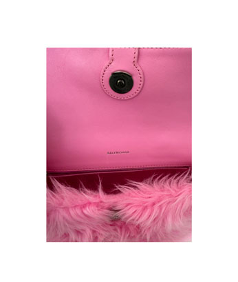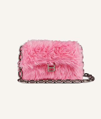 The Balenciaga Downtown Shoulder Bag With Chain in candy coloured pink fake fur is playful and modern. This accessory is ideal for bold fashion enthusiasts. The silver chain strap introduces a modern accent to the design.