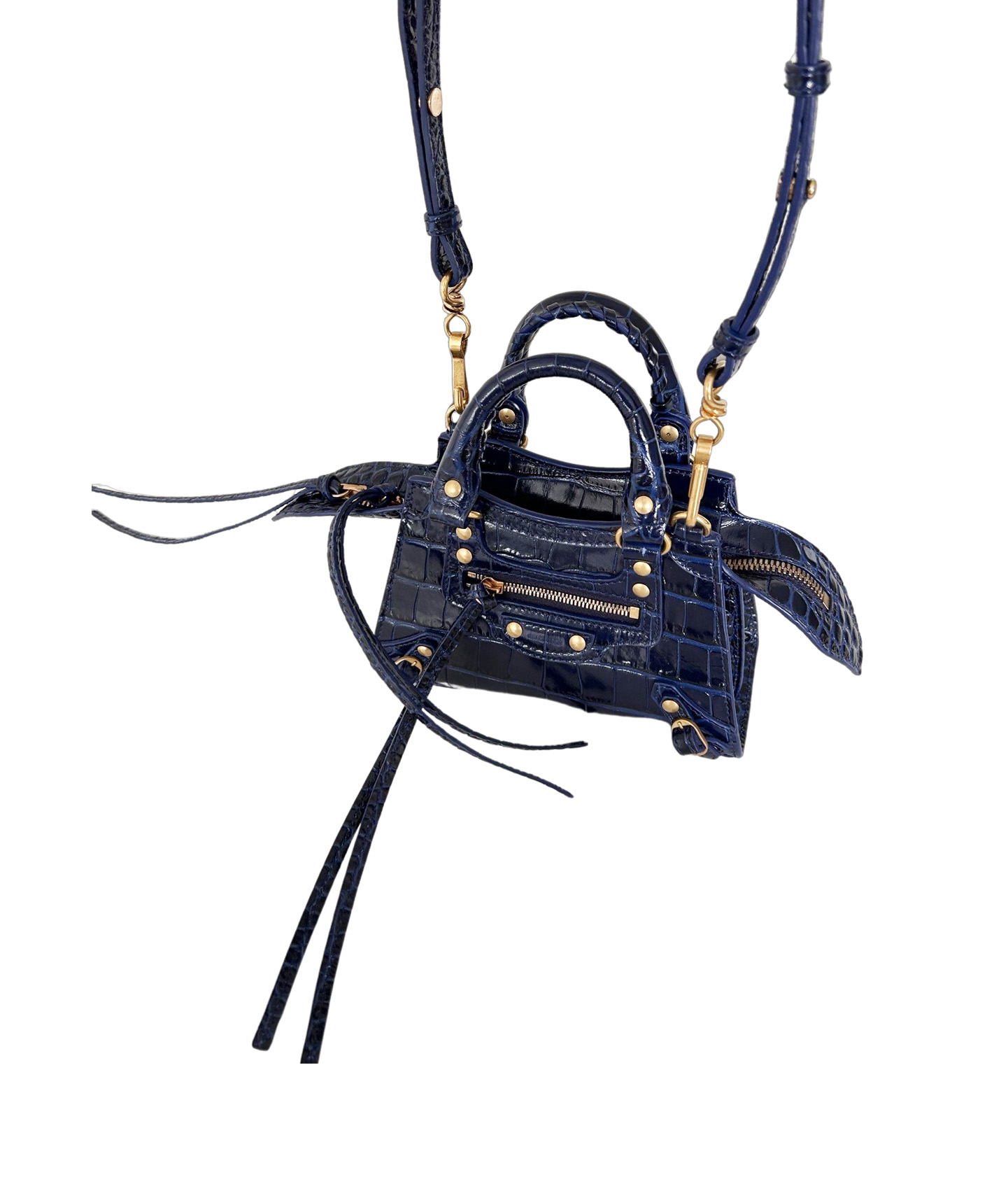 Balenciaga’s signature Neo Classic tote bag takes on a fun form in this micro royal blue patent leather tote. The bag comes with a detachable cross body strap and can be worn crossbody or with top handles. Please take note of tiny measurements. Jujami would classify this as a micro bag.