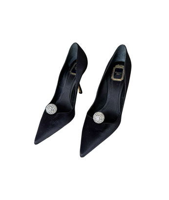 Exude sophistication and glamour with the Christian Dior Black Satin Crystal Ball Embellished Pumps. Crafted from sumptuous black satin, these exquisite heels showcase dazzling crystal ball embellishments, adding a refined sparkle to every step. The pointed-toe silhouette enhances their timeless elegance, making them a perfect choice for special occasions.