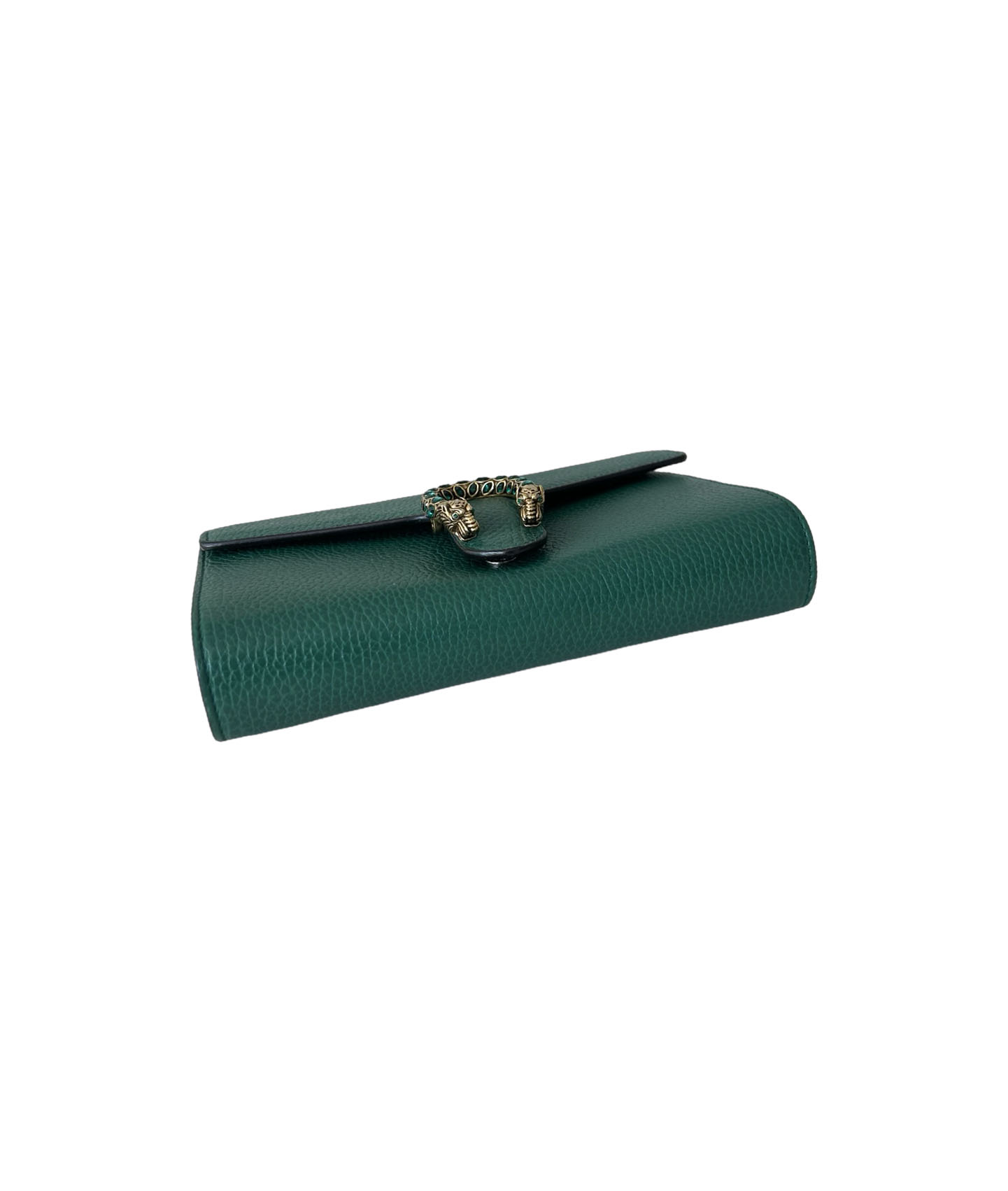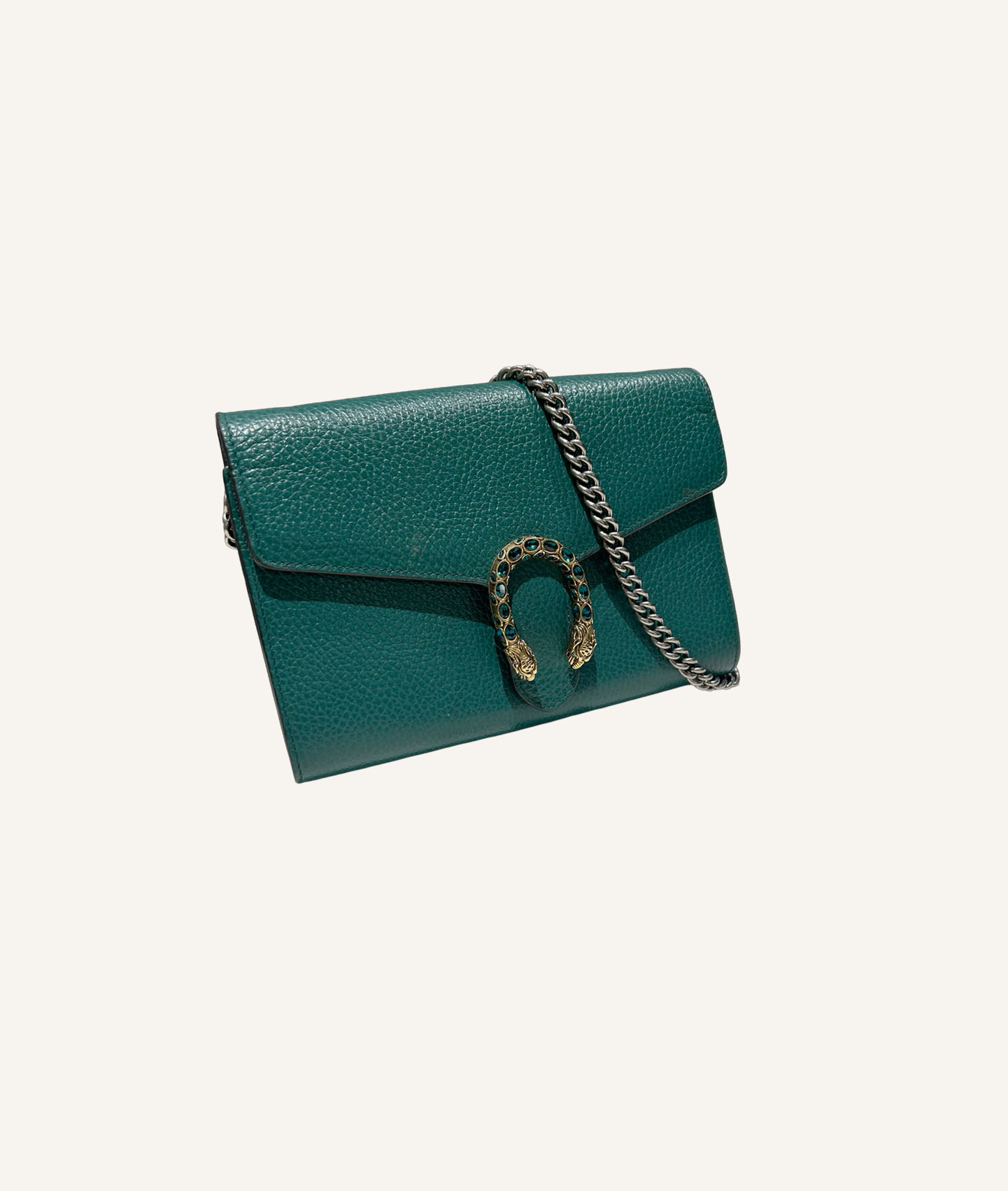 A compact leather chain mini bag or wallet featuring a distinctive textured tiger head spur closure, inspired by the Greek god Dionysus. The tiger head, adorned with Swarovski crystal stones, adds a luxurious finish. Crafted from durable, textured leather. This bag can be worn crossbody or the detachable chain strap can be removed to be worn as a clutch. This bag comes with dustcover and box.