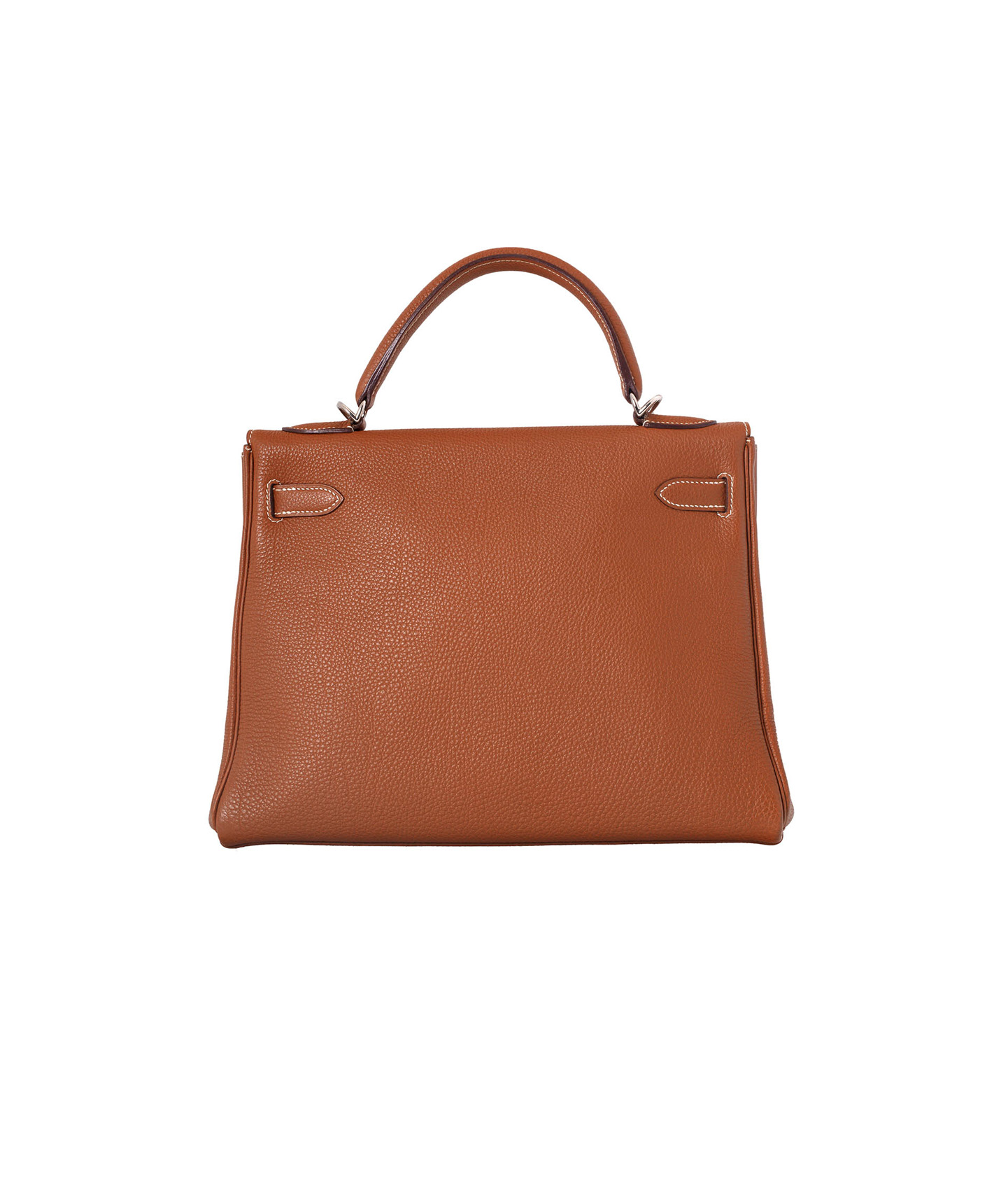 This vintage Hermes Kelly is a true masterpiece, meticulously hand-stitched to perfection. The Kelly Retourne 32, crafted from luxurious Togo leather in Gold (tan), features elegant palladium hardware. The Retourne style offers a more relaxed feel, with visible stitching that creates softer edges. Its leather-lined interior includes pockets and ample space for all your daily essentials. Elevate your collection with this timeless Collector’s Item.