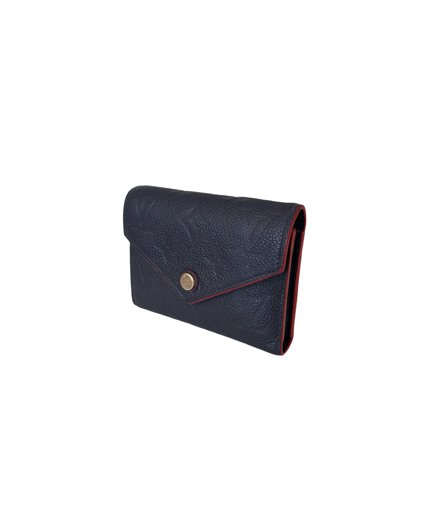 The Victorine wallet has been updated in Monogram Empreinte leather in navy featuring a red inner trim. Perfect as a gift, this compact wallet opens up to reveal a surprisingly roomy interior, featuring multiple pockets and six card slots. The envelope-style flap is secured with a press-stud. This bag has been used but remains in very good condition with minimal signs of wear on its hardware. It comes with a box and dustcover.