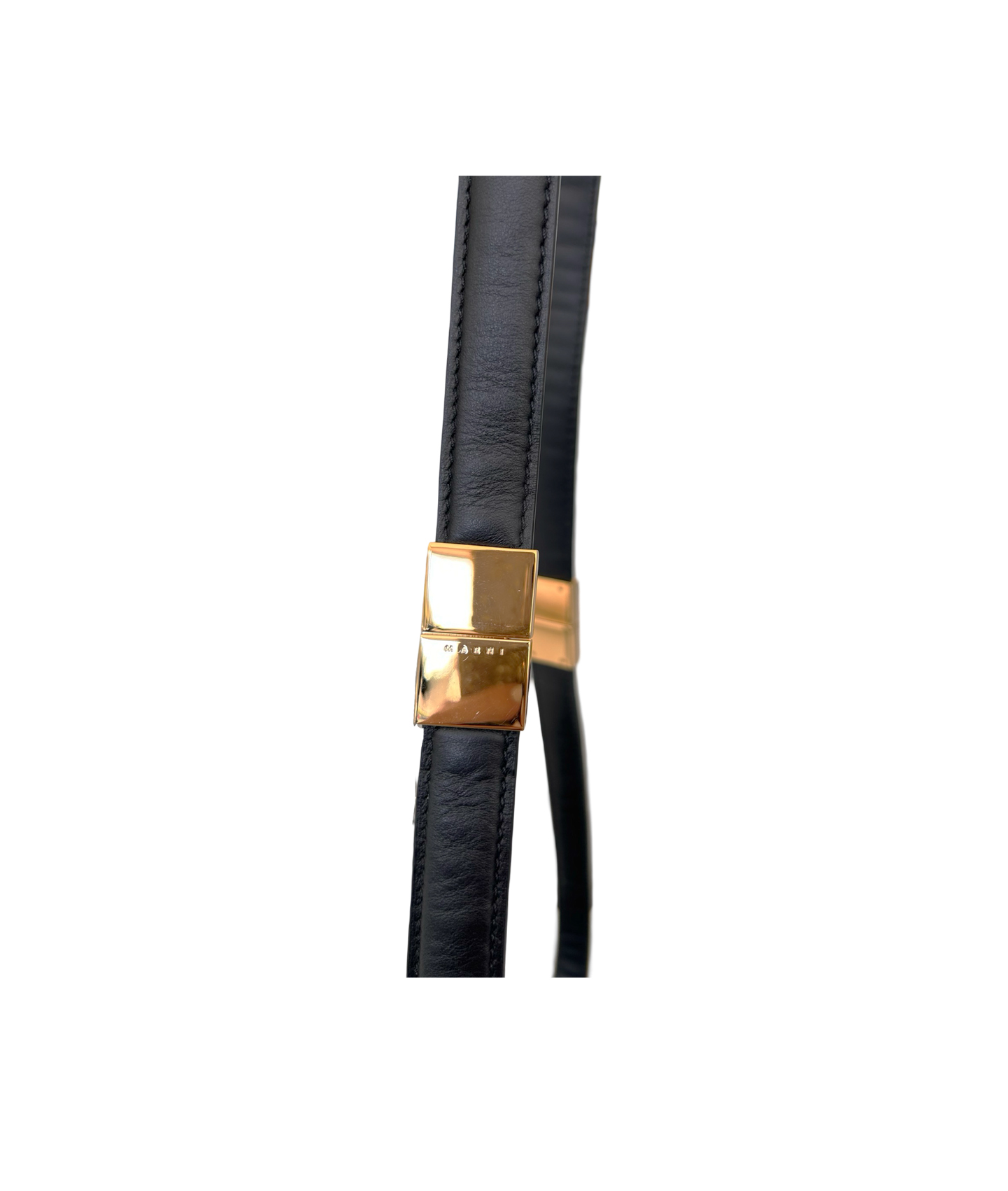 The Small Prisma bag is crafted from luxurious puffy calfskin leather. It features a flap closure with a metal clasp, opening to reveal two compartments and an interior zip pocket. The leather shoulder strap includes an extension for versatility. The bag is adorned with shiny gold hardware and an embossed Marni gold logo on the back. This Brand New Italian-made handbag is a sophisticated work of art and comes with her dustcover.