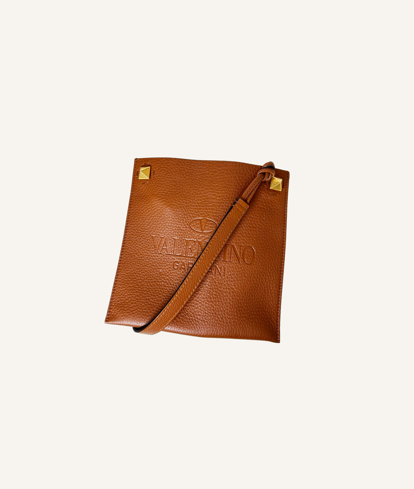 Update your accessories with a timeless addition. This logo-debossed messenger bag from Valentino Garavani is crafted from tan, textured calf leather and opens up to a small interior. Carry the essentials in sleek style. Condition: Brand New.