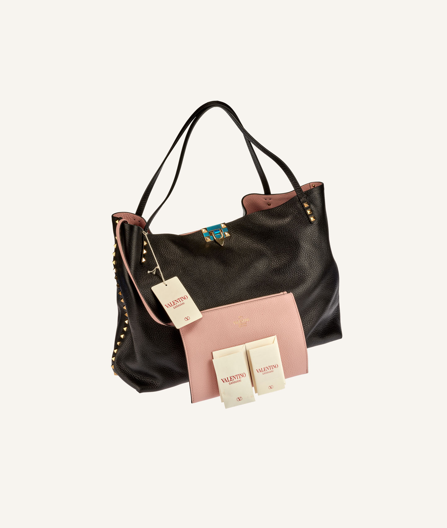 Made from black calf leather, with a pale pink interior, this Valentino tote is a beauty. The little leather pochette is extremely useful for additional storage. This bag is brand new.