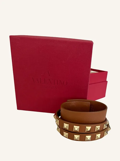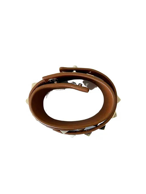 Introducing the Valentino Leather Rockstud bracelet in tan. This beautiful accessory blends trendy aesthetics with elegance. The iconic Rockstud detailing elevates the item’s design. This beauty is Brand New.