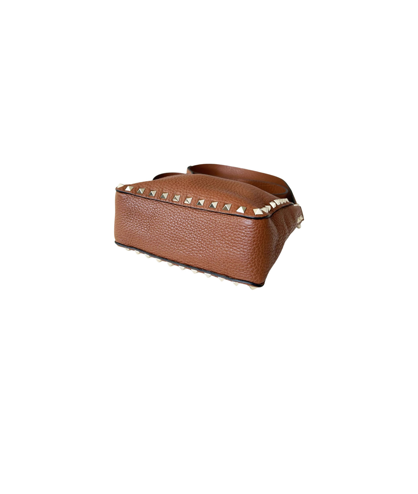 The gorgeous Valentino Rockstud Flip-Lock Hobo Bag is made from Calfskin grained leather in tan. The adjustable flat crossbody strap makes the bag easy to wear and the flip-lock closure makes it easy to secure your belongings. This bag has the Valentino signature gold-toned rockstuds with an interior pocket and is luxuriously lined in suede.